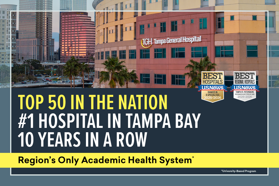 Tampa, FL (July 29, 2025) – Tampa General Hospital (TGH) is once again and for the 10th straight year, the #1 hospital in the Tampa Bay region, according to U.S. News & World Report's 2025-2026 Best Hospitals rankings. Tampa General continues its reign as one of Florida’s top hospitals and earns recognition as one of the top 50 hospitals in the nation in multiple specialties.